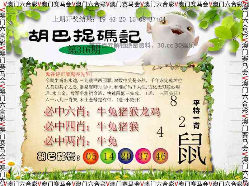╠解胡巴抓码记╣317期:今有灵码三十七,三二降至九参尾,蓝红美女单玄机,龙吟虎驸三更发扬长而去三比六,一金一土一方火,羊马猪虎猴有特,上天不负苦心人送;火水金。今期生肖定牛羊,呂奉先射戟轅門。(送:二零四头开)二码八码格处红,單福新野遇英主。(送:合单开) |